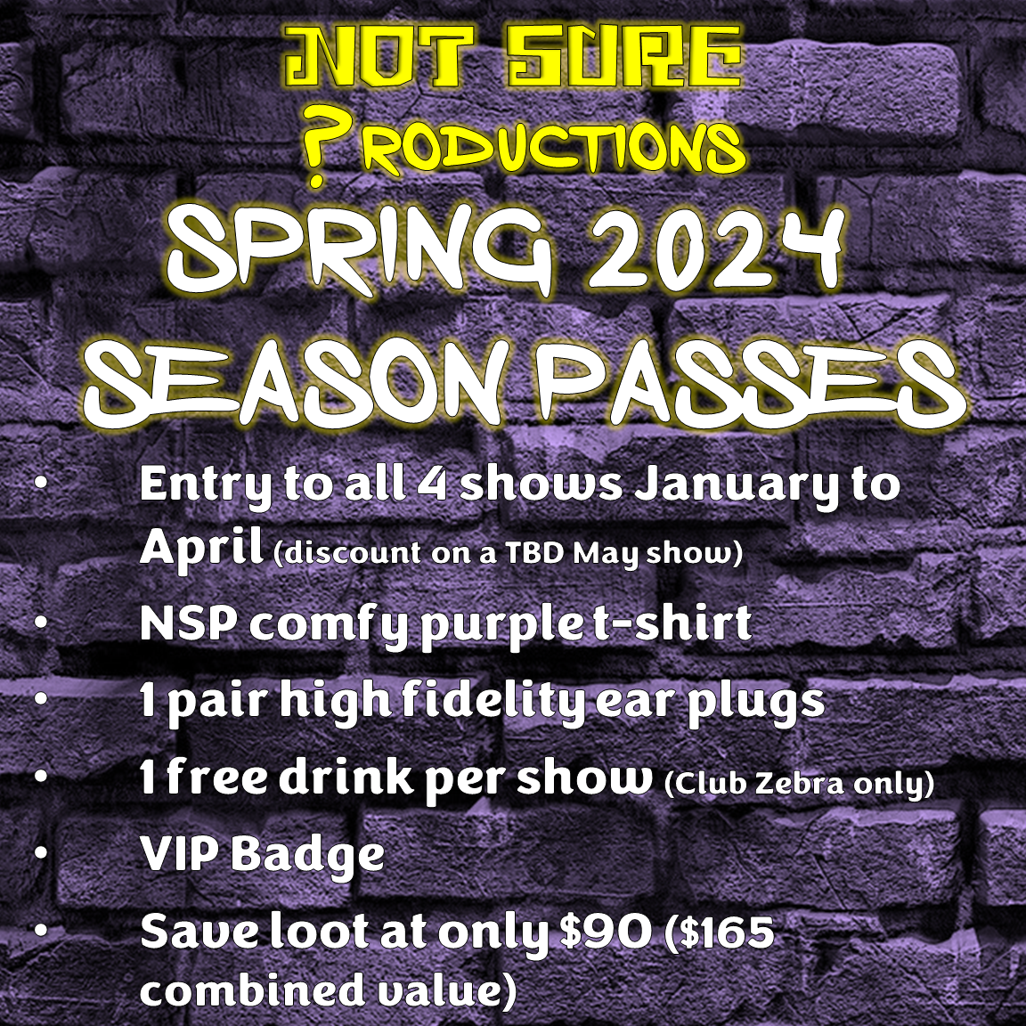The crew at Not Sure Productions are always looking for ways to provide value for our audience and we are pleased to announce a season pass for our winter/spring 2024 schedule. If you are a regular at our events this is for you! We have one national touring headliner show booked every month January through April.
